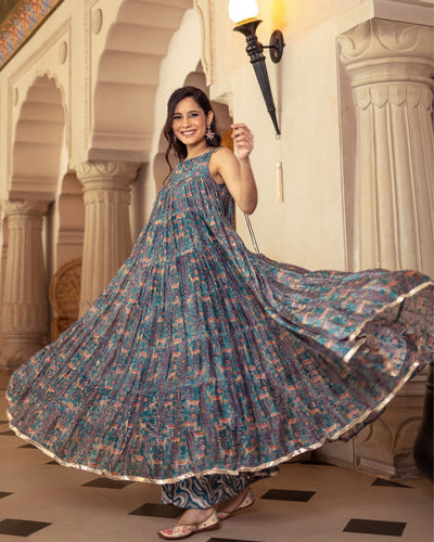 Introducing the Amrapali Chanderi Gotapatti Suit Set - a dreamy flair in every stitch, a graceful silhouette you won't forget. The intricate handblock print on the luscious Chanderi fabric creates a visual treat for the eyes, making it a must-have for this wedding season.